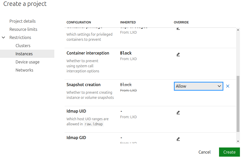 lxc project create my-restricted-project --config restricted=true --config restricted.snapshots=allow