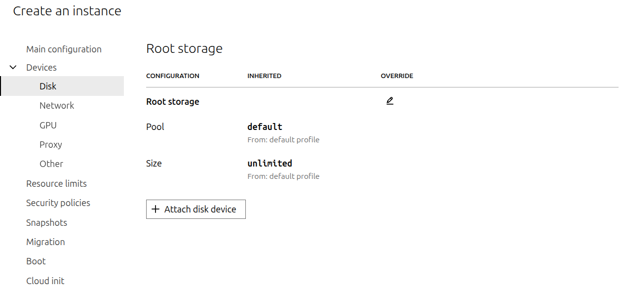 Instance storage volumes are created in the storage pool that is specified by the instance’s root disk device. This configuration is normally provided by the profile or profiles applied to the instance. See Default storage pool for detailed information.